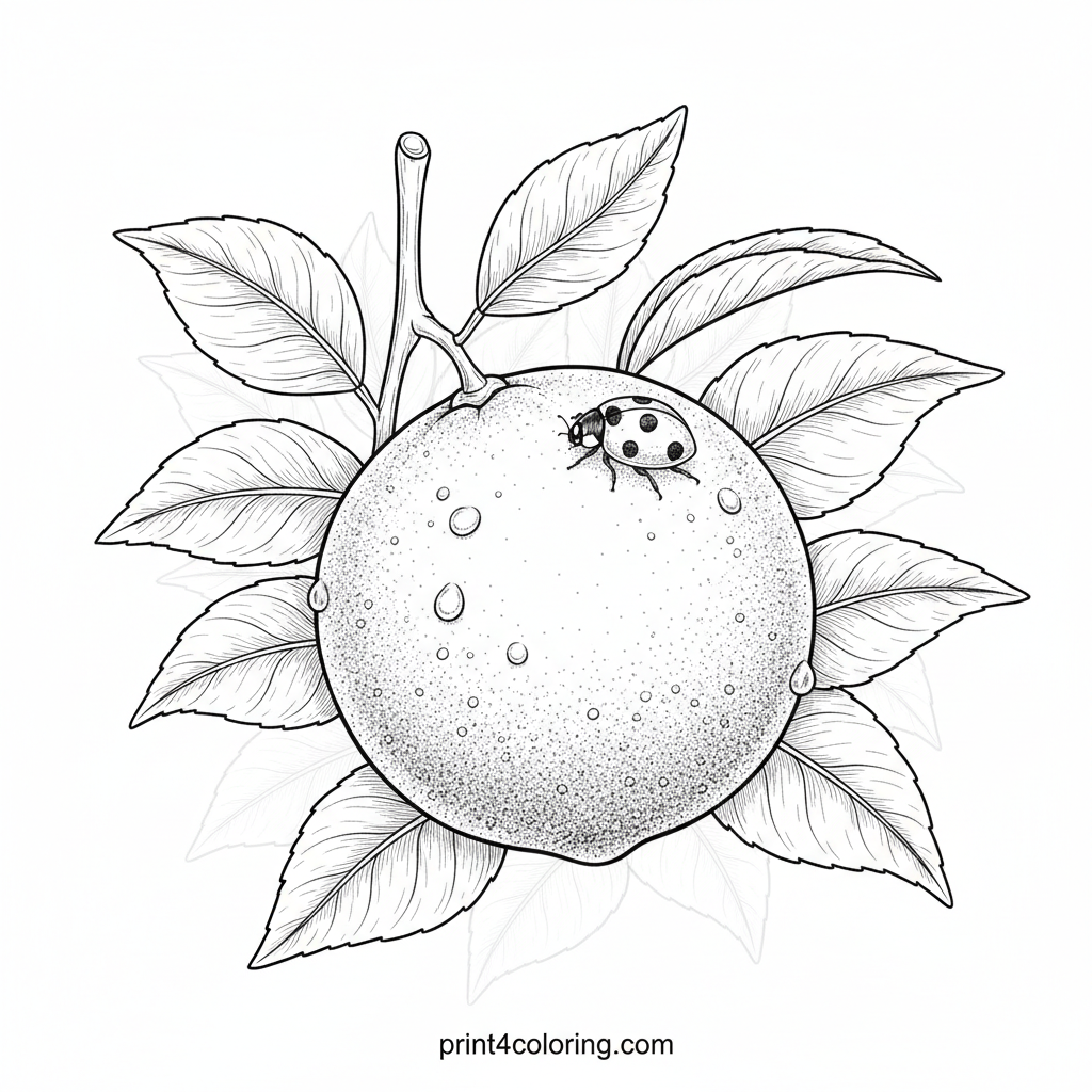 Discover a charming close-up of a tiny ladybug resting gently on a perfectly ripe lime, sparkling with glistening dew drops. Observe her delicate spots and the finely drawn lime leaves. This intricate scene invites you to bring vibrant life and color to every beautiful detail.