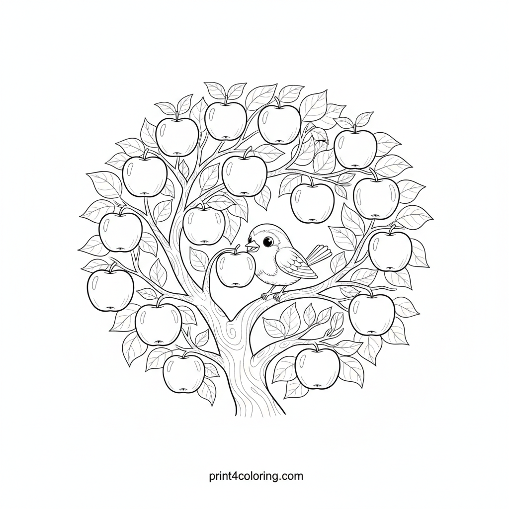 Step into a cozy autumn scene! This detailed illustration features a young apple tree bursting with ripe, round apples. A sweet little robin is perched gently on a branch, enjoying a juicy apple snack. Explore the intricate textures of leaves, bark, and fruit, bringing this delightful moment to life with your favorite colors.