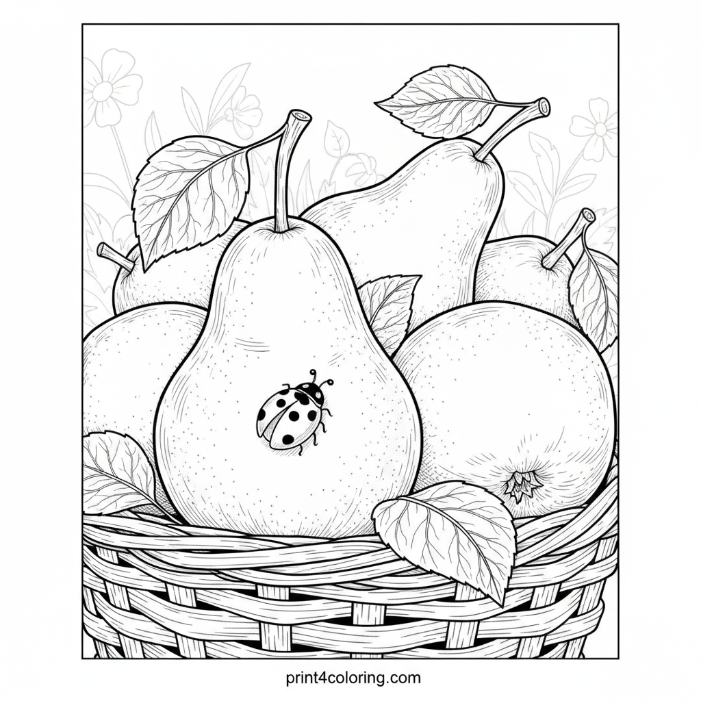 Immerse yourself in a bountiful harvest! This detailed coloring page features a close-up of a rustic woven basket overflowing with juicy, ripe pears. Delicate leaves still cling to some, adding natural charm. A friendly ladybug explores a pear. A delightful scene waiting for your vibrant colors!