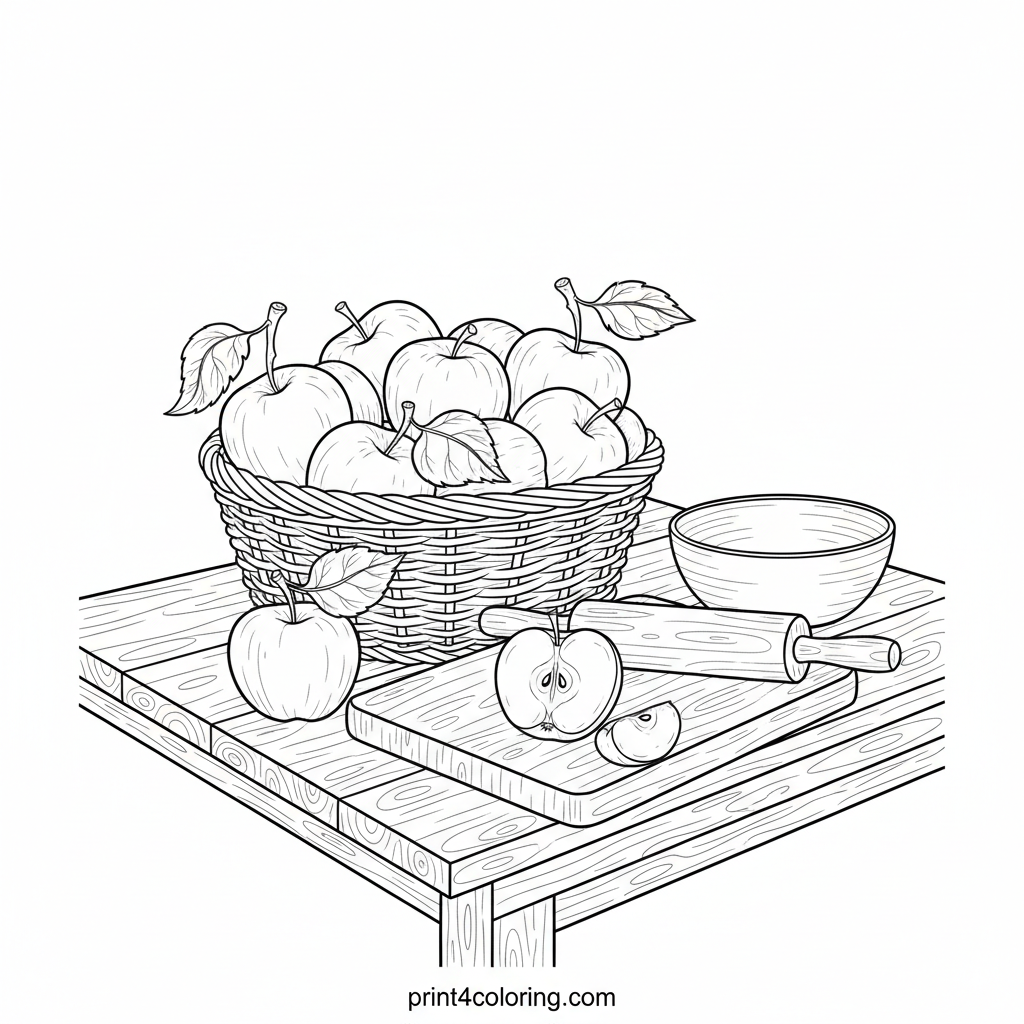 Dive into the cozy warmth of an autumn kitchen! This detailed coloring page features a rustic wooden table laden with a basket overflowing with fresh apples. A half-sliced apple, rolling pin, and ceramic bowl await your creative colors, all bathed in gentle sunlight. Perfect for expert colorists.