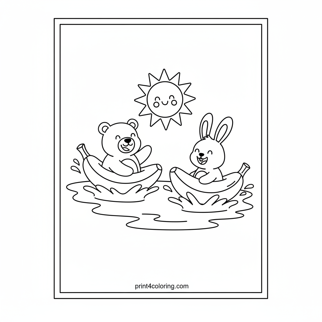 Join a happy bear and a giggling rabbit as they embark on a delightful banana boat race! They're paddling with joy across a calm, wavy blue puddle, all under the watchful, smiling sun. This playful scene is perfect for little artists to bring to life with bright, cheerful colors. Get ready for some splashy fun!