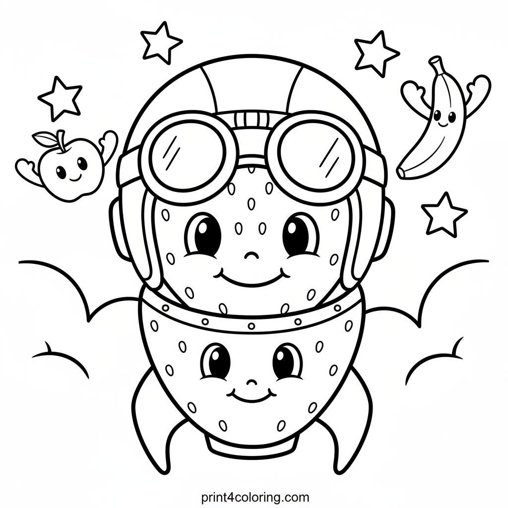 Join a cheerful strawberry pilot on a sweet space adventure! Wearing a cool helmet, they zoom in a smiling strawberry rocket past puffy clouds and twinkling stars. Friendly fruit planets, like a smiling apple or banana, wave from the background. Color this berry-exciting cosmic race!