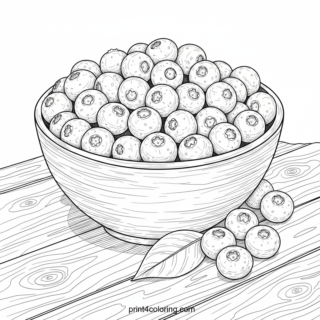 Immerse yourself in the rustic charm of a farm-fresh scene! This detailed coloring page features a ceramic bowl overflowing with ripe blueberries, nestled on a textured wooden farm table. Notice the scattered berries and the delicate leaf, all ready for your artistic touch. A perfect still life for budding artists!