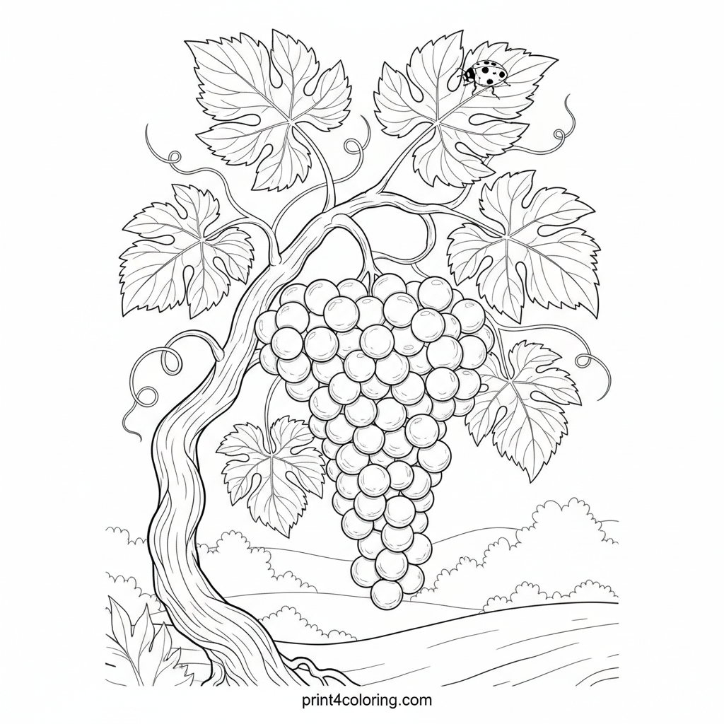 Explore the intricate beauty of a bountiful grapevine cluster! This expert-level coloring page showcases lush, ripe grapes, delicate tendrils, and textured leaves. Spot a tiny, charming ladybug perched gently on a leaf, adding a sweet surprise to this detailed natural scene.