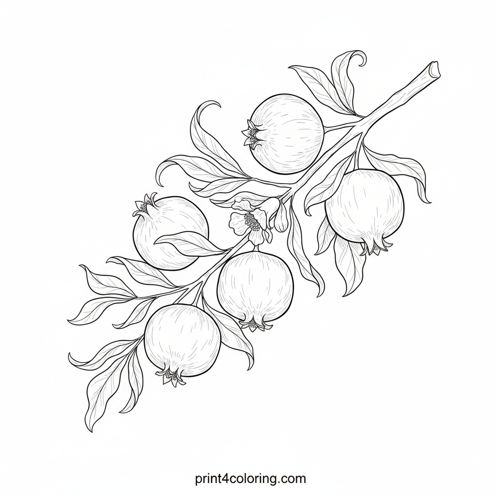 Explore the beauty of nature with this intricate coloring page featuring a bountiful pomegranate branch! Discover ripe pomegranates, detailed leaves, and a delicate flower. Perfect for practicing fine motor skills and appreciating the wonders of fruit. Get ready to bring vibrant colors to this delicious scene!