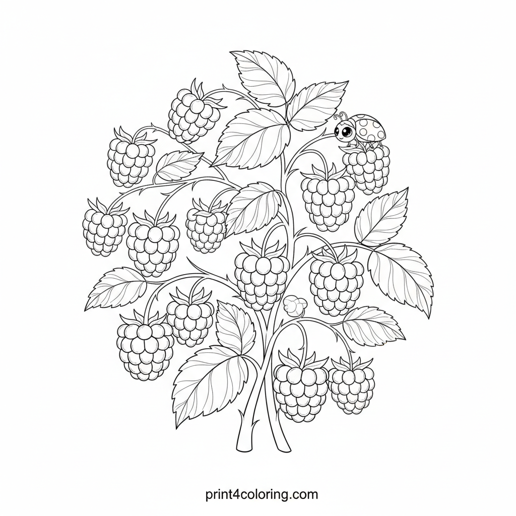 Bountiful Raspberry Bush with Ladybug Friend Coloring Page