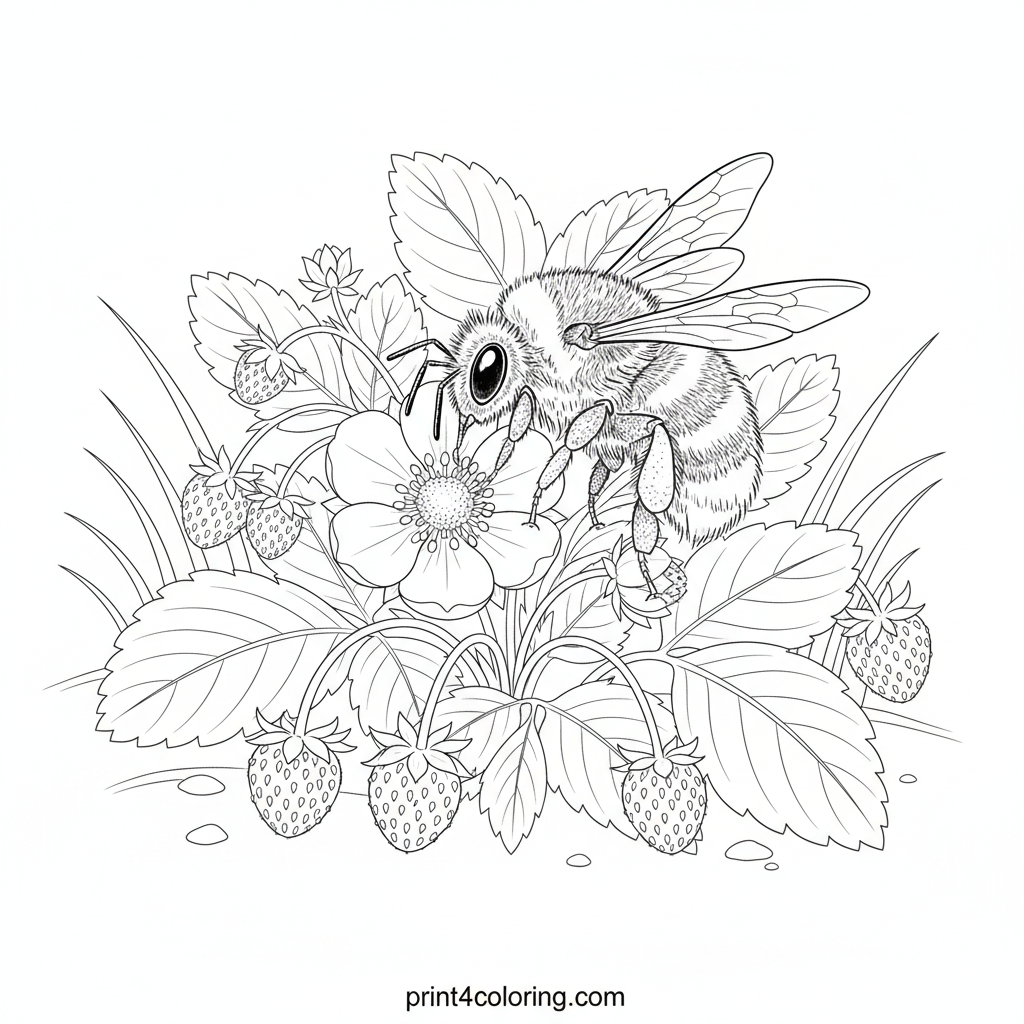 Dive into the delightful world of a busy bumblebee! This expert-level coloring page features a fluffy bee diligently pollinating delicate strawberry flowers. Explore intricate petals, developing green strawberries, and the bee's textured body and transparent wings in this realistic garden scene. A truly rewarding challenge for detailed artists!