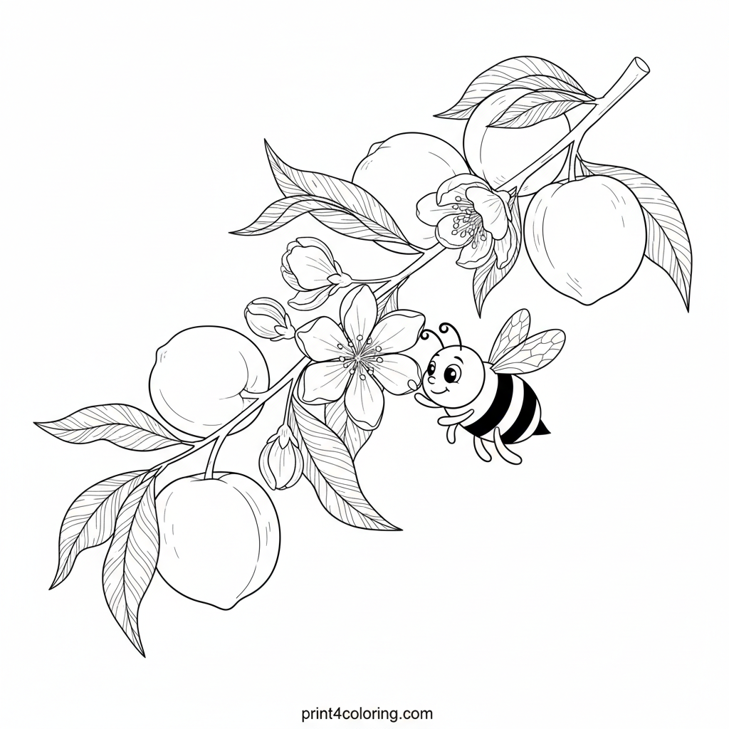 Dive into a sweet summer scene! This expert coloring page features a highly detailed nectarine branch, showcasing ripe, smooth nectarines and delicate blossoms. A friendly, plump bee is diligently collecting nectar, adding a touch of buzzing life. Bring this intricate botanical illustration to vibrant life with your favorite colors!