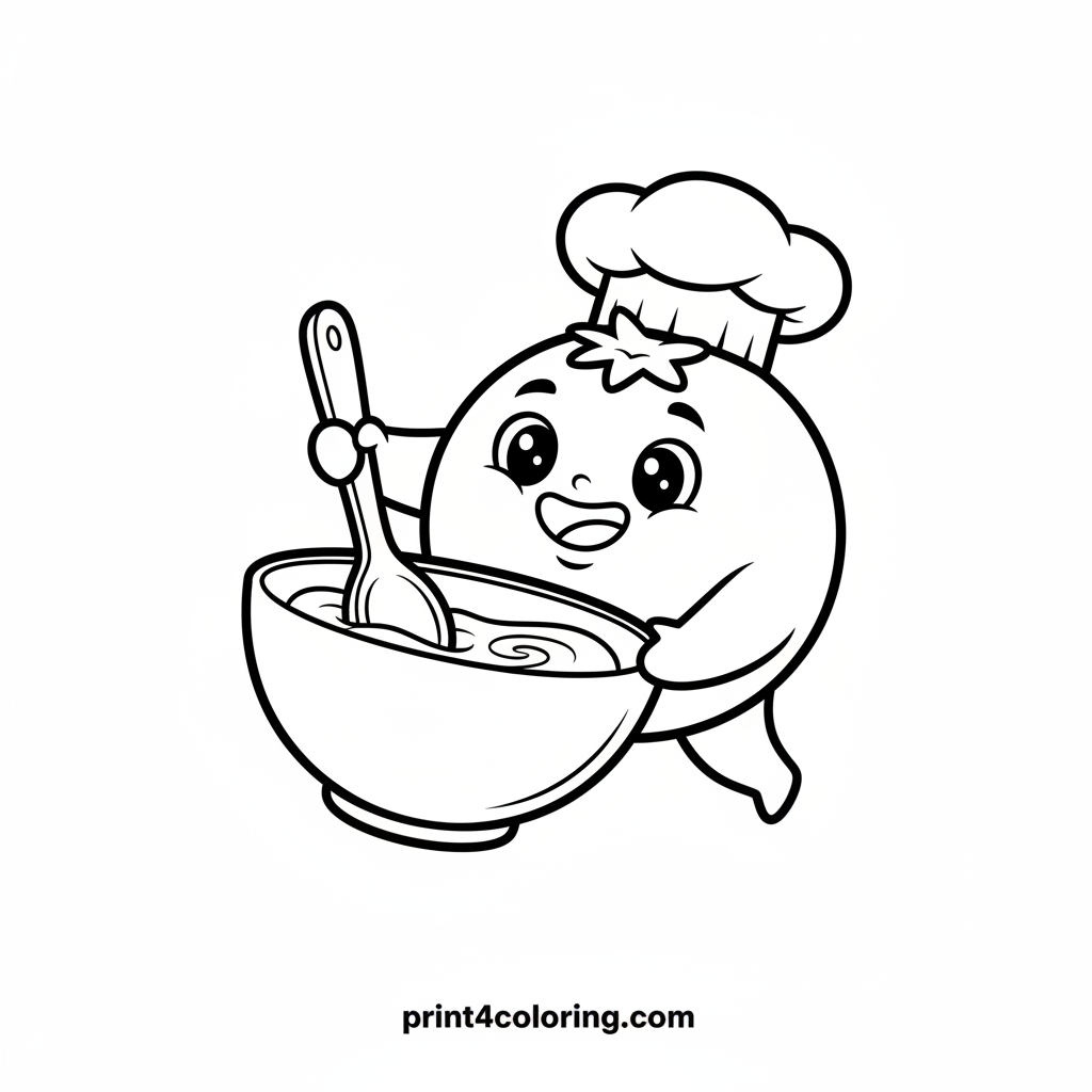 Join Chef Blueberry in the kitchen as he happily stirs up a delicious sweet treat! With his chef's hat perched just right, he's mixing a big bowl of batter, ready to bake something wonderful. This cheerful scene is perfect for little chefs to color with all their favorite vibrant colors and imagine the yummy smells.