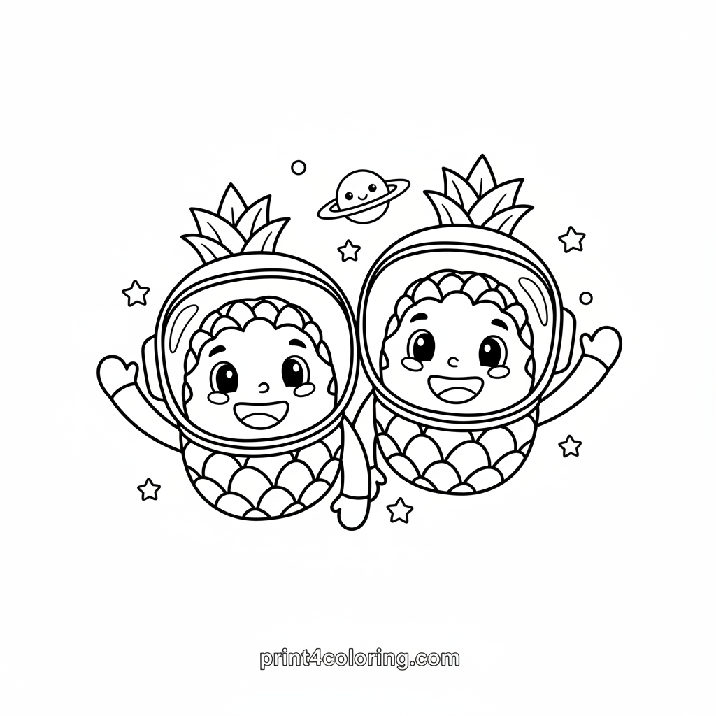 Get ready for an out-of-this-world coloring adventure! Meet two super friendly pineapple astronauts, floating gently through the starry cosmos. They're wearing adorable space helmets and waving their leafy crowns next to a colorful cartoon planet. Imagine all the amazing colors you can use to bring their space journey to life!