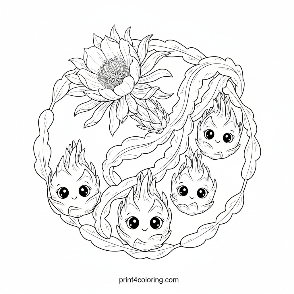 Explore the enchanting world of the dragon fruit plant! This detailed illustration invites you to color its unique segmented stems, a magnificent night-blooming flower, and ripe, scaly fruits. Discover the intricate textures of this exotic plant in a cozy garden setting, perfect for a relaxing coloring adventure.