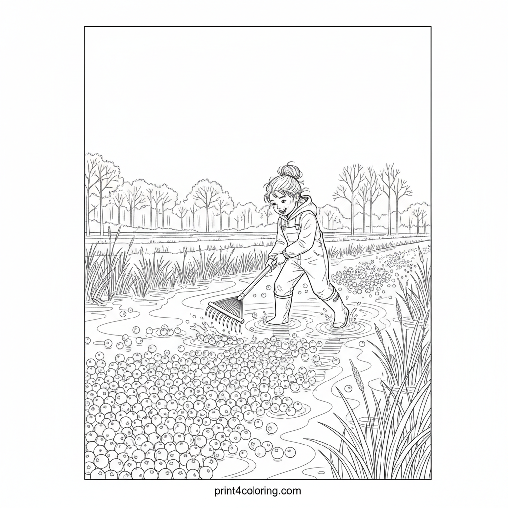 Immerse yourself in the vibrant world of a cranberry harvest! This detailed scene captures a flooded bog brimming with bright red cranberries floating like jewels on the water. Explore the surrounding marsh plants and distant trees under a clear sky, as a small figure gently tends to the bountiful berries. A fascinating autumn adventure awaits your colors!
