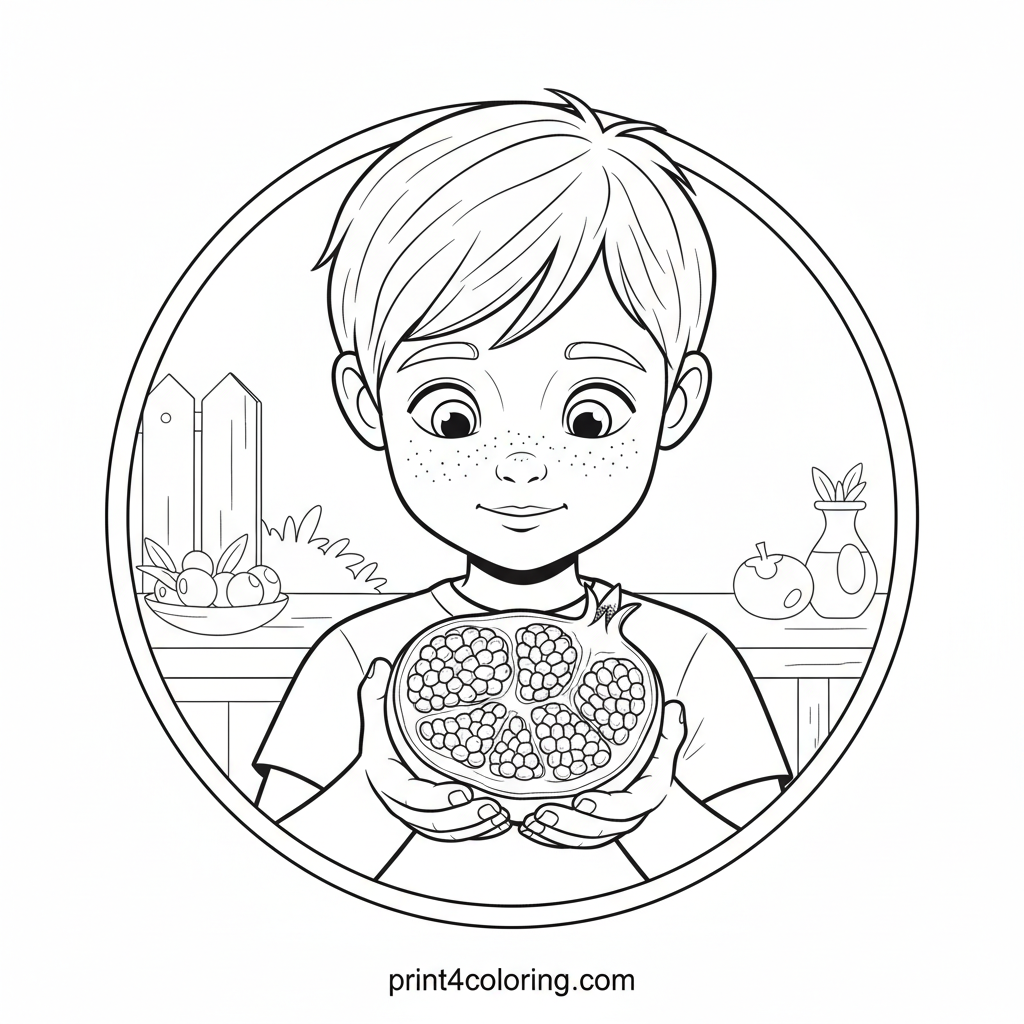 Join a sweet, curious child as they gently hold a half-cut pomegranate, marveling at its sparkling red seeds. This cozy scene captures a moment of wonder and discovery, inviting you to add vibrant colors to the child's expression and the juicy fruit. Imagine a simple garden or kitchen setting, perfect for a relaxing coloring adventure.