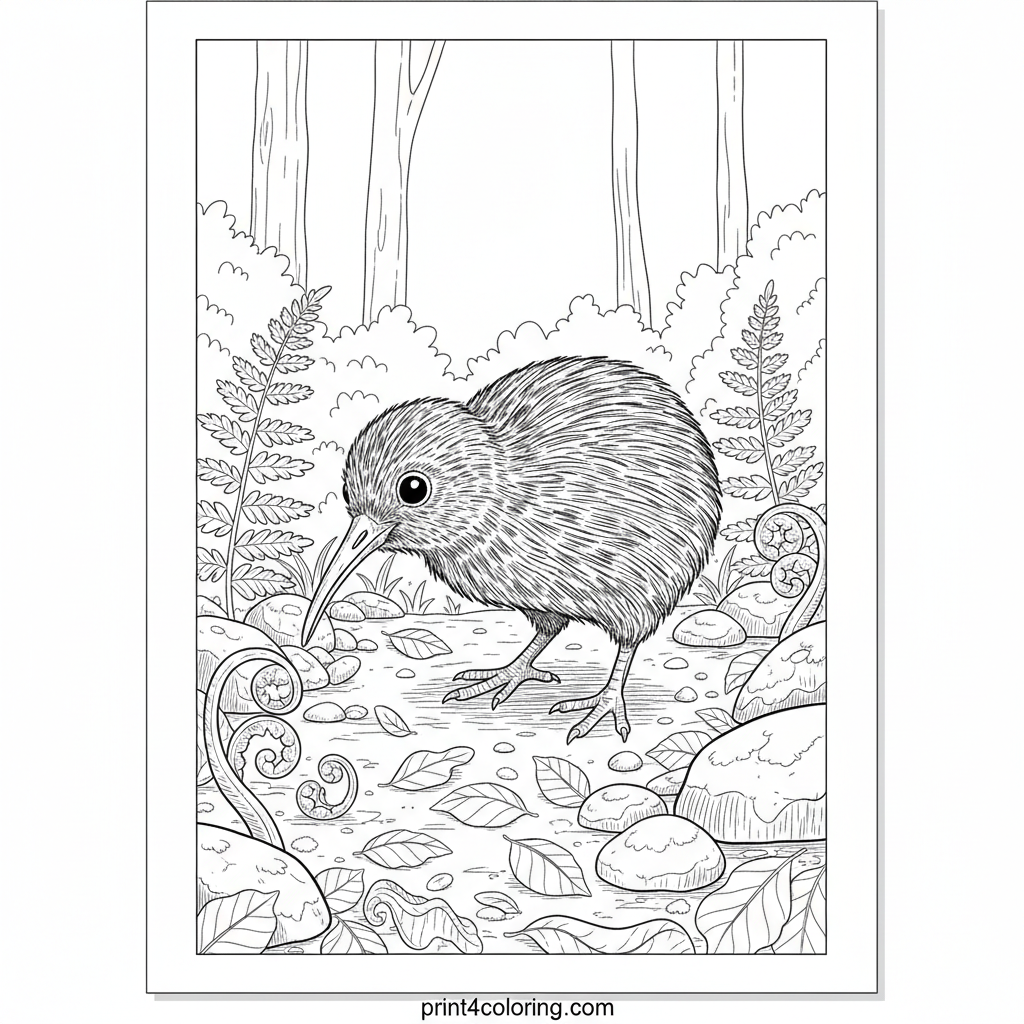 Step into the enchanting world of the New Zealand forest! Color a detailed scene featuring a curious kiwi bird, its long beak exploring the rich forest floor. Observe the intricate ferns, soft moss, and scattered leaves as the nocturnal bird searches for tasty treats. A delightful challenge for expert colorists!