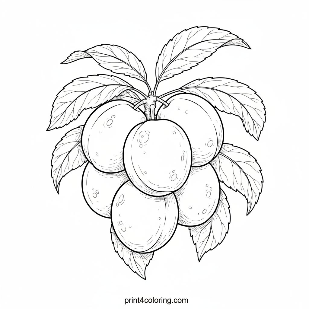 Dive into nature's beauty with this expert coloring page. A close-up of ripe plums hangs from a leafy branch, each fruit textured and unique. Intricately drawn leaves with delicate veins suggest a gentle breeze. Bring this botanical masterpiece to life, capturing every tiny detail with your colors.