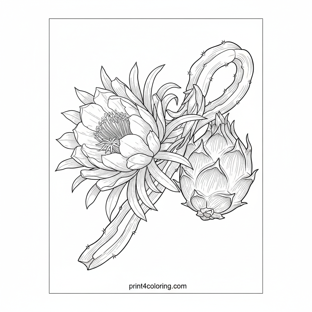 Exotic Dragon Fruit Botanical Study Coloring Page