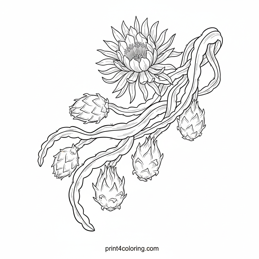 Dive into the intricate world of the dragon fruit plant! This expert-level coloring page features a detailed botanical illustration, highlighting thick, segmented stems, a magnificent night-blooming flower, and ripe fruits. Explore the unique textures of the fruit's scales and the stem's spines, bringing this vibrant tropical beauty to life.