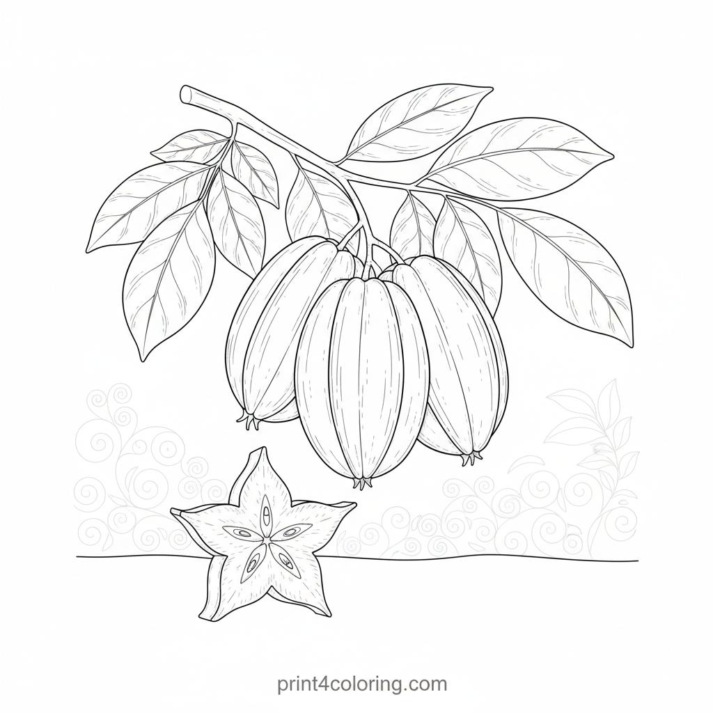 Discover the intricate beauty of the star fruit! This expert coloring page features a detailed branch with ripe, star-shaped fruits among lush leaves. One fruit is meticulously sliced open, revealing its unique five-pointed star cross-section. Explore the delicate textures and vibrant potential of this tropical wonder, perfect for experienced colorists.