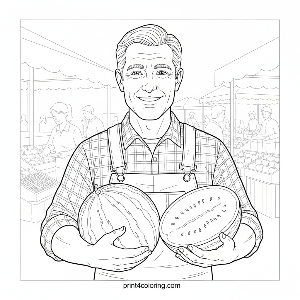 Dive into the heart of a bustling farmer's market! This detailed coloring page showcases a friendly farmer carefully arranging a magnificent display of whole and sliced watermelons. Explore intricate rind patterns and juicy red interiors, with other market treasures softly in the background. A delightful scene for expert colorists!