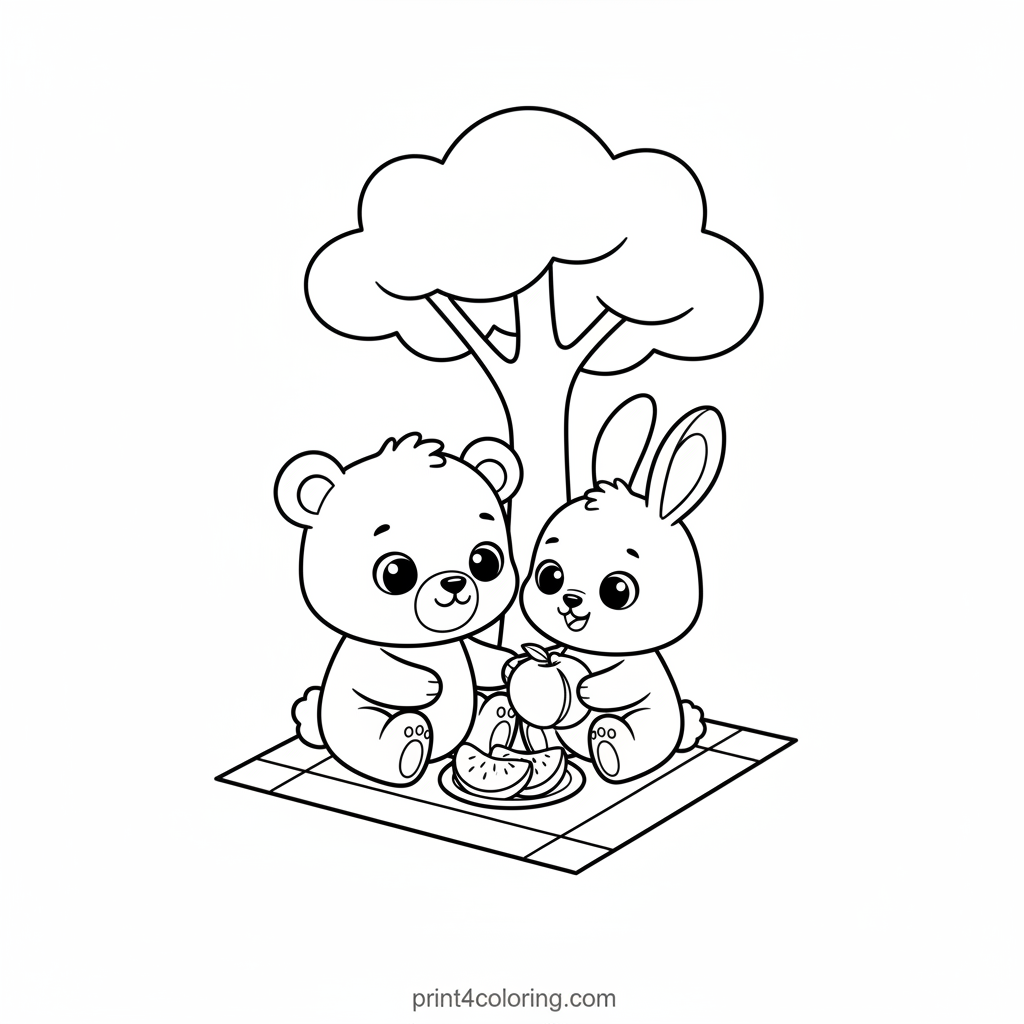 Join an adorable bear cub and a fluffy bunny rabbit as they share a delightful nectarine picnic! They're sitting cozy on a blanket under a leafy tree, giggling over juicy slices of fruit. This heartwarming scene is perfect for little artists to bring to life with their favorite colors and imagination.