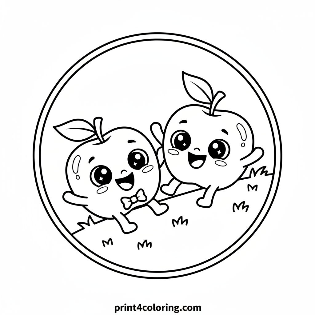 Roll into fun with two cheerful, anthropomorphic apples! With big smiles and tiny arms and legs, they giggle playfully as they tumble down a grassy hill. One even wears a dapper bow tie, adding to their whimsical adventure. A delightful scene perfect for bright colors!