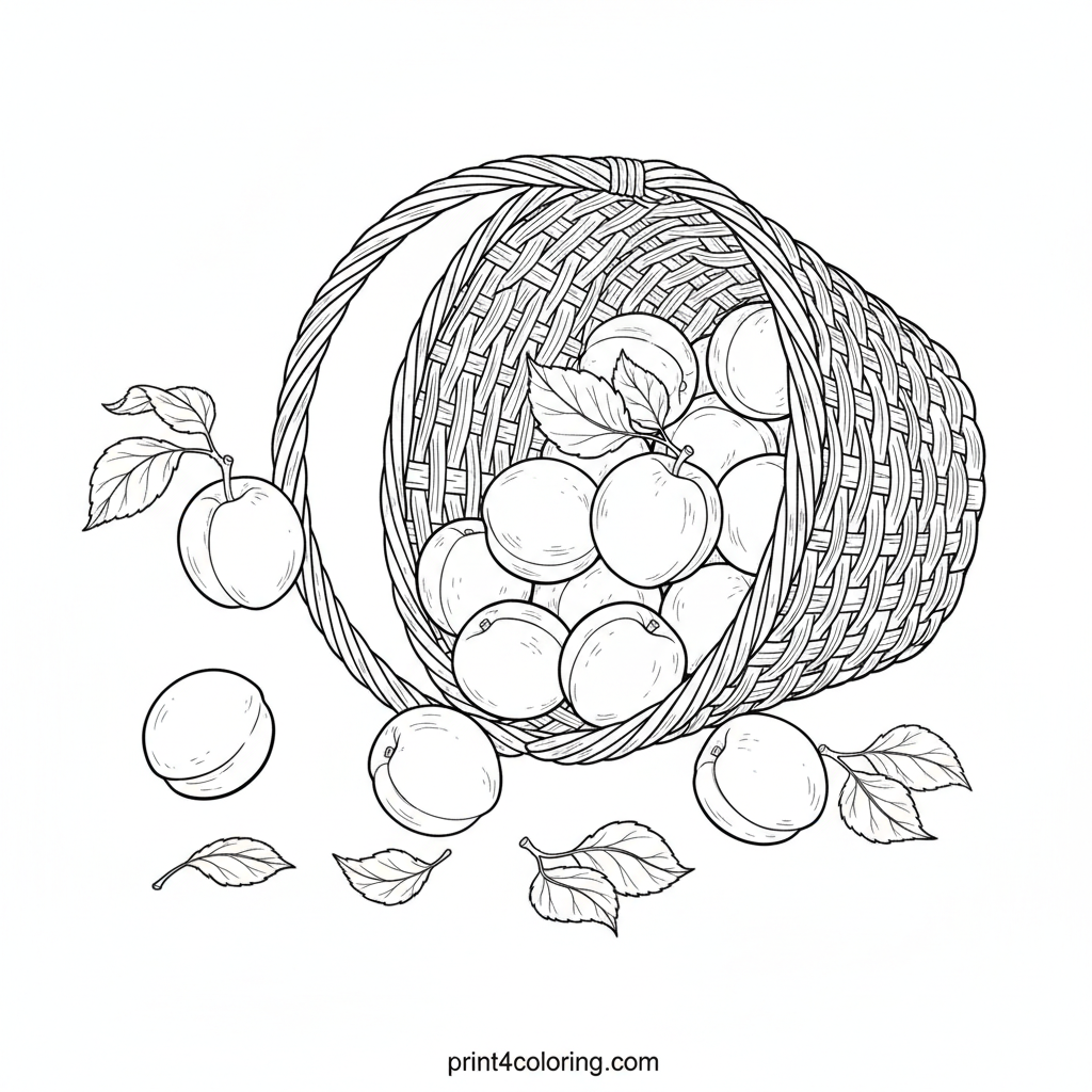 Dive into a delicious coloring adventure with this detailed illustration! A rustic woven basket overflows with sun-kissed golden apricots, some still clinging to leafy branches. Explore the rich textures of the basket and the soft fuzz of the fruit, bringing this bountiful harvest scene to life with your vibrant colors.