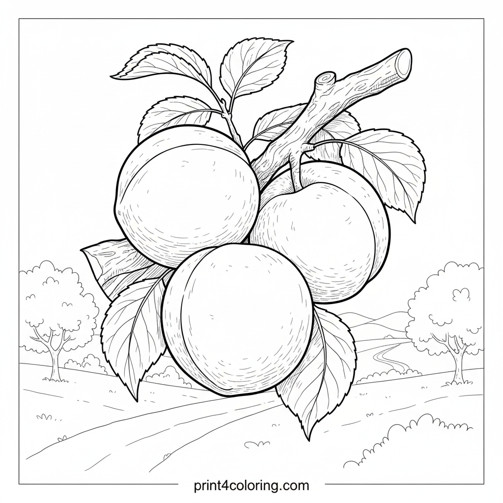 Step into a sun-drenched apricot orchard, where rows of trees glow with ripe, juicy fruit. A gentle path invites you to explore, with distant rolling hills under a clear sky. Color the detailed leaves, branches, and plump apricots in this beautiful, fruitful scene.