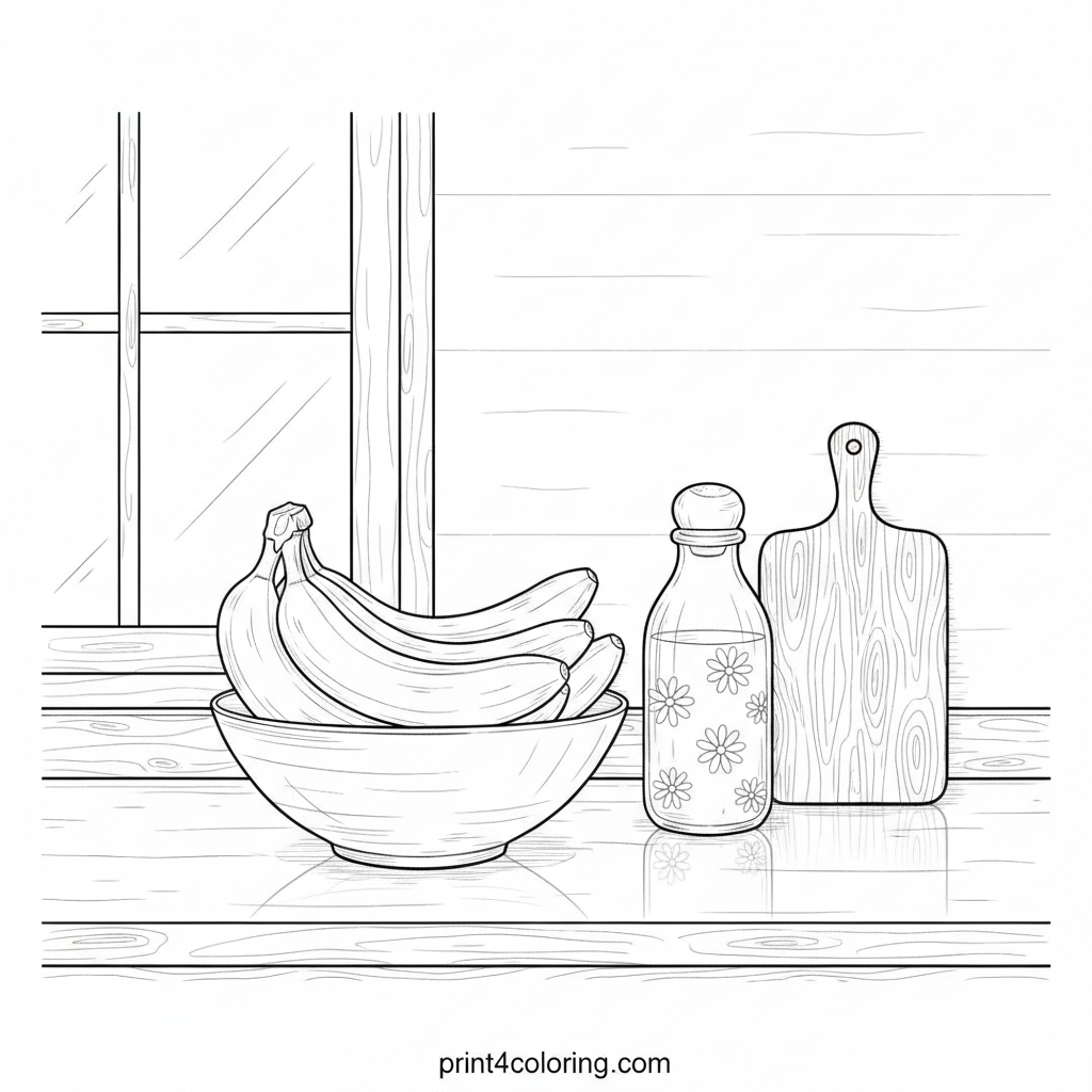 Step into a beautifully drawn kitchen scene! Color a bountiful bowl of ripe bananas, gleaming on a polished counter. Add shades to a vintage glass milk bottle and a rustic wooden cutting board, bringing this detailed still life to vibrant life with your creativity.