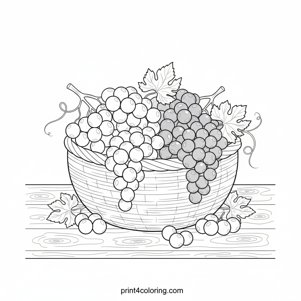 Dive into the delightful world of a rustic grape harvest! This cozy coloring page features a beautifully woven basket overflowing with juicy green, red, and purple grapes. Delicate vine leaves and a few loose grapes are scattered on a charming wooden table, inviting you to add vibrant colors to this sweet still life scene.