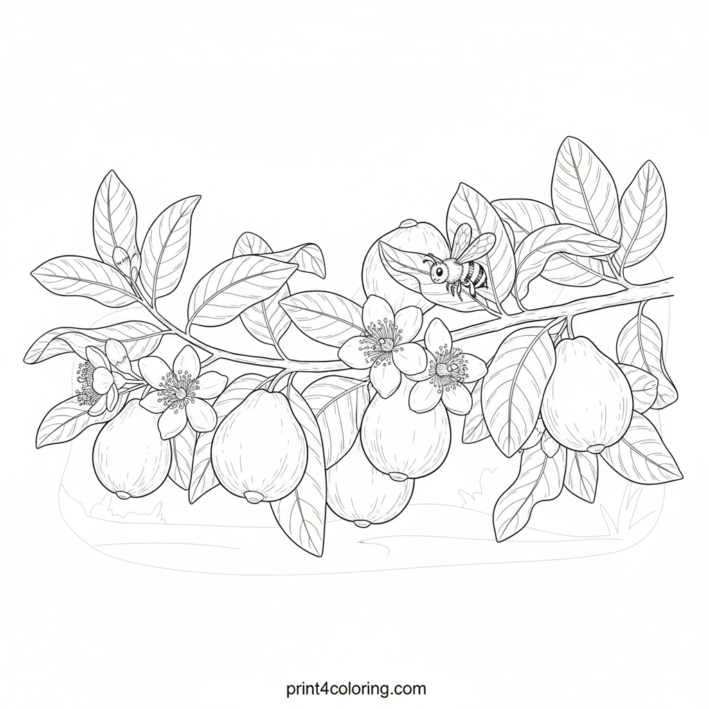 Explore a vibrant guava tree branch brimming with life! Discover juicy ripe guavas, budding green fruits, and delicate white blossoms. A tiny, friendly bee buzzes happily, collecting nectar. This detailed scene offers a delightful coloring challenge for all ages, perfect for nature lovers and budding artists.