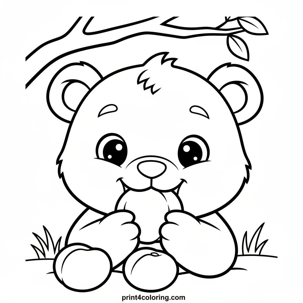 Join a happy baby bear cub as he enjoys a delicious plum picnic under a leafy tree! With big, friendly eyes and a juicy plum in his paws, this little bear is having the best time. Color the soft grass and the ripe plums scattered around him in this adorable scene.