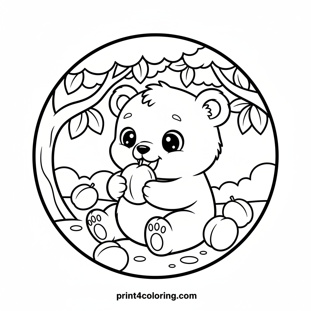 Join a cheerful baby bear cub as he enjoys a delightful plum picnic! This friendly little bear is happily munching a juicy plum under a big, leafy plum tree. Plump plums are scattered on the soft grass, creating a cozy woodland scene just waiting for your vibrant colors. So sweet!