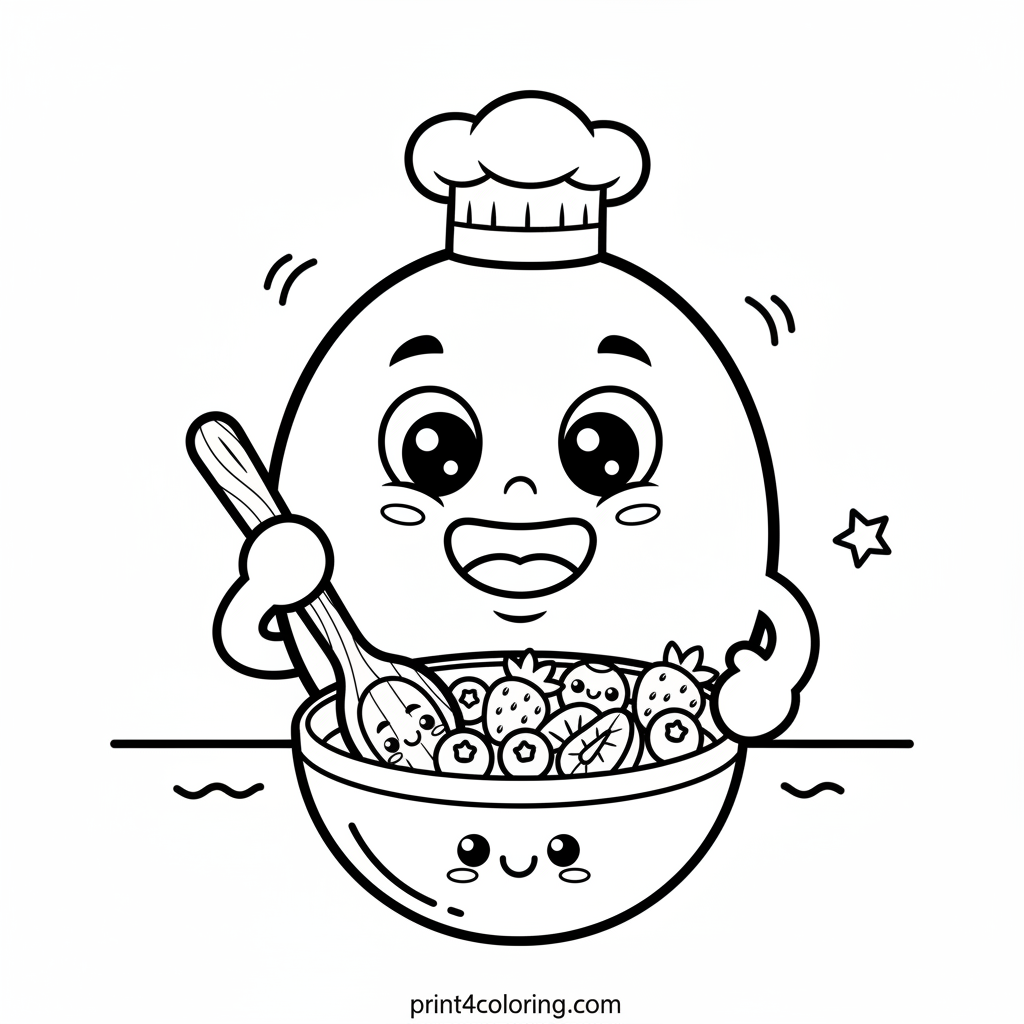 Join Chef Kiwi as he whips up a delightful fruit salad! This cheerful kiwi character, wearing a cute chef's hat, is stirring a big bowl filled with smiling strawberries, blueberries, and other happy fruits. Get ready to add vibrant colors to this yummy scene and bring Chef Kiwi's kitchen to life!