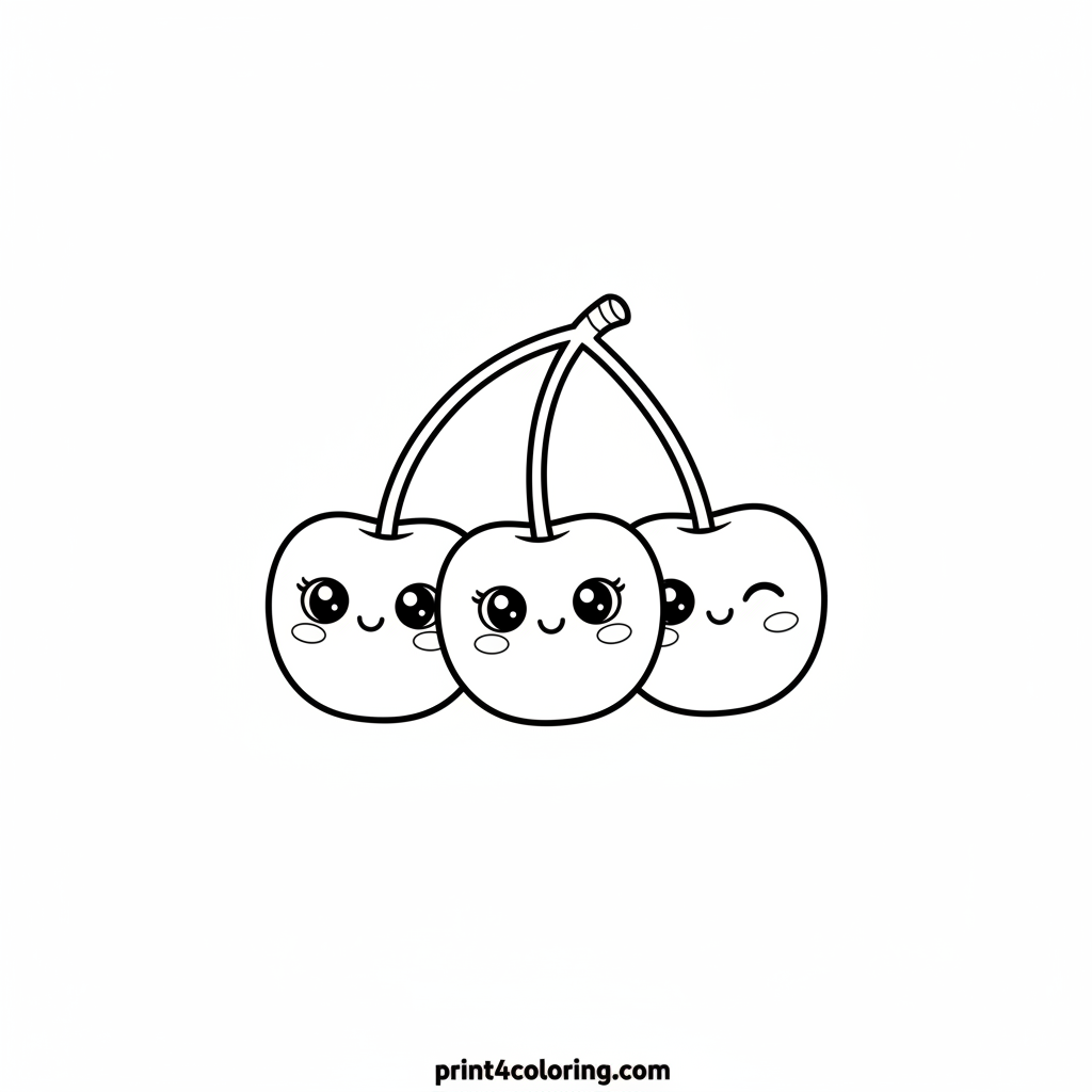 Dive into a delightful coloring adventure with this happy cherry family! Three plump, smiling cherries with rosy cheeks are linked by a shared green stem. One playful cherry is even winking at you. Bring this sweet and cozy scene to life with your favorite colors and make them extra cheerful!