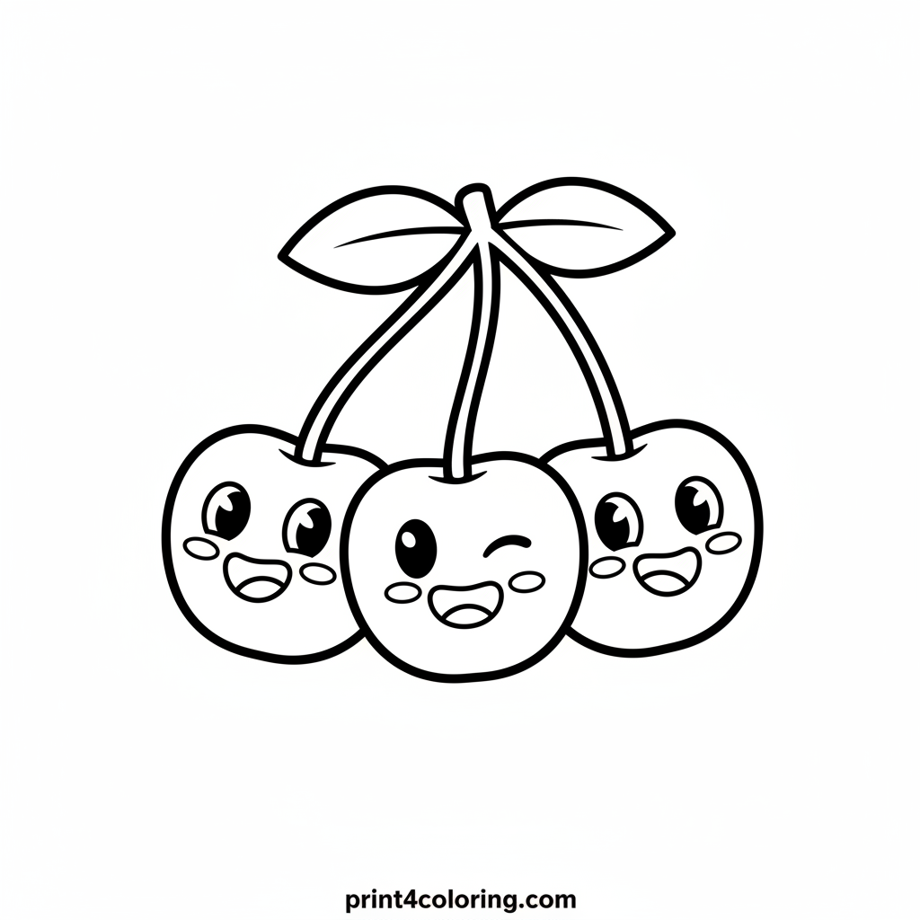 Get ready to color a delightful close-up of the happiest cherry family! This charming trio of plump cherries is all smiles, with rosy cheeks and a shared green stem. One playful cherry even gives a friendly wink. Bring these sweet fruits to life with your favorite colors and make their day even brighter!