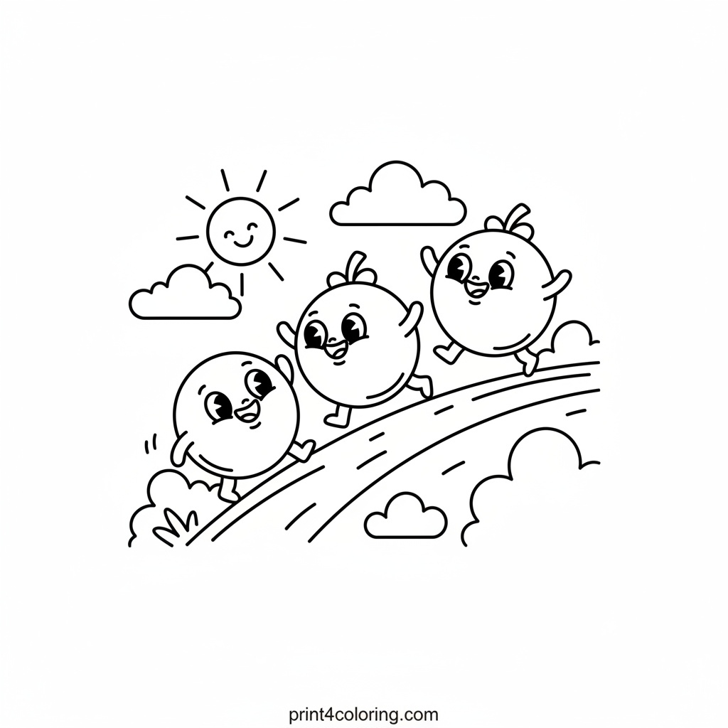 Join three adorable, smiling grapes as they embark on a joyful journey! Watch them playfully roll down a sunny, gentle hill, their tiny arms and legs wiggling with delight. This cute scene is perfect for little artists to bring to life with their favorite colors, adding sunshine and fun to their day!