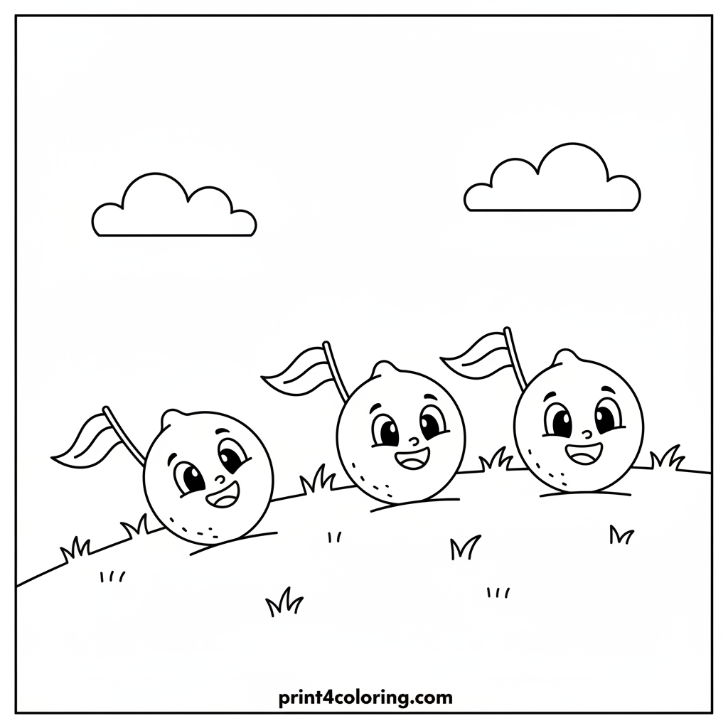 Join three happy, round lemons as they speed down a gentle, grassy hill! Each lemon has a big smile and a cute leaf flag fluttering in the breeze. Grab your crayons and add vibrant colors to this zesty, fun race. Who do you think will win the rolling adventure?