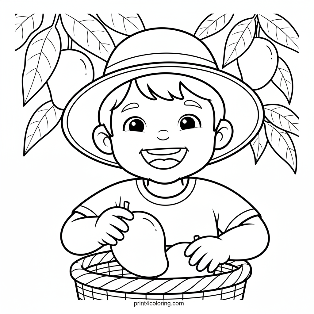 Join a cheerful child on a sunny day as they carefully gather delicious, ripe mangoes into a round basket. With a big smile and a cool sun hat, this little picker is enjoying the sweet rewards of the mango tree. Get ready to add vibrant colors to this joyful harvest scene!