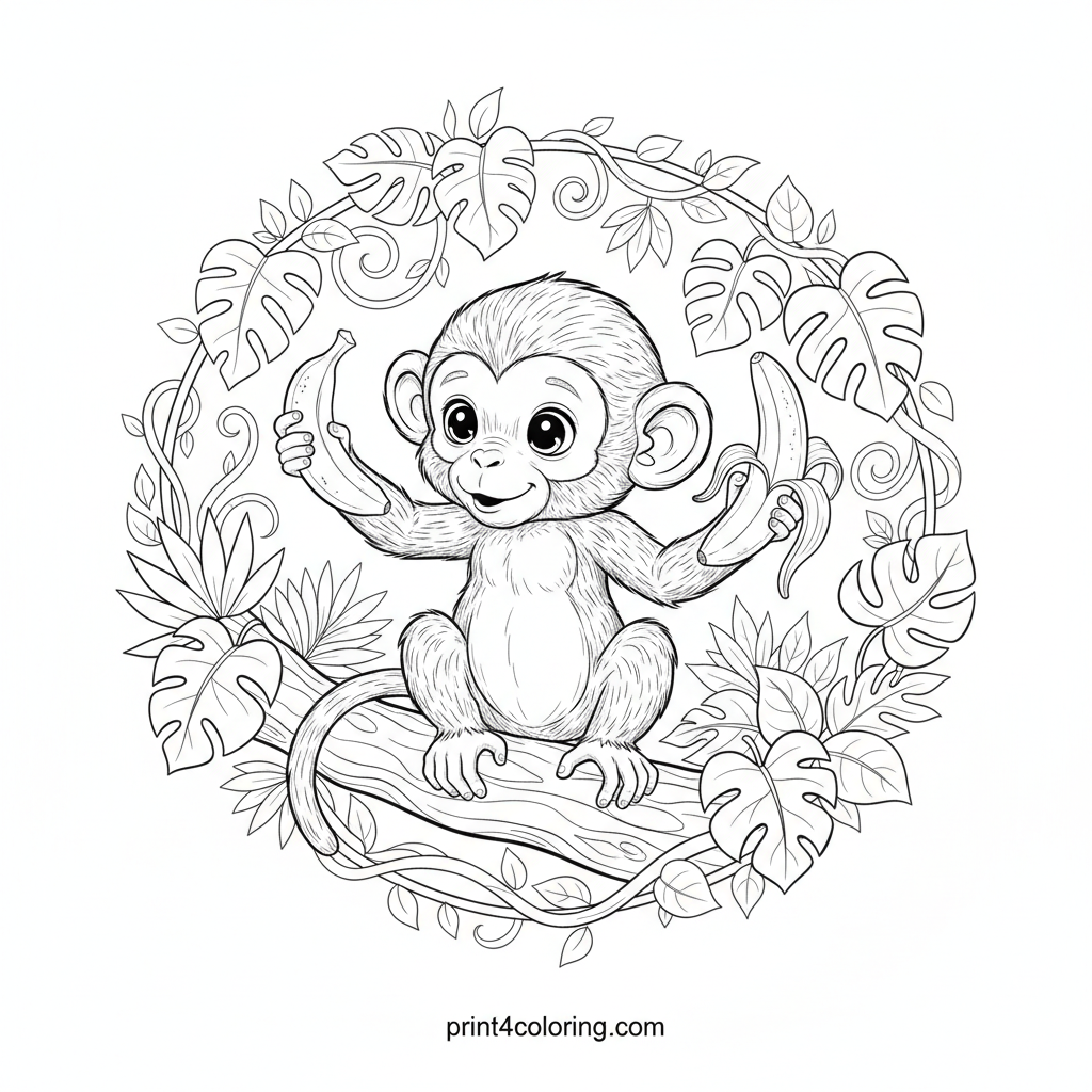Join a happy, detailed monkey as it playfully reaches for a delicious banana from a bountiful bunch. Perched comfortably on a sturdy gnarled branch, this scene comes alive in a lush jungle, surrounded by vibrant tropical plants and winding vines. A delightful challenge for expert colorists!
