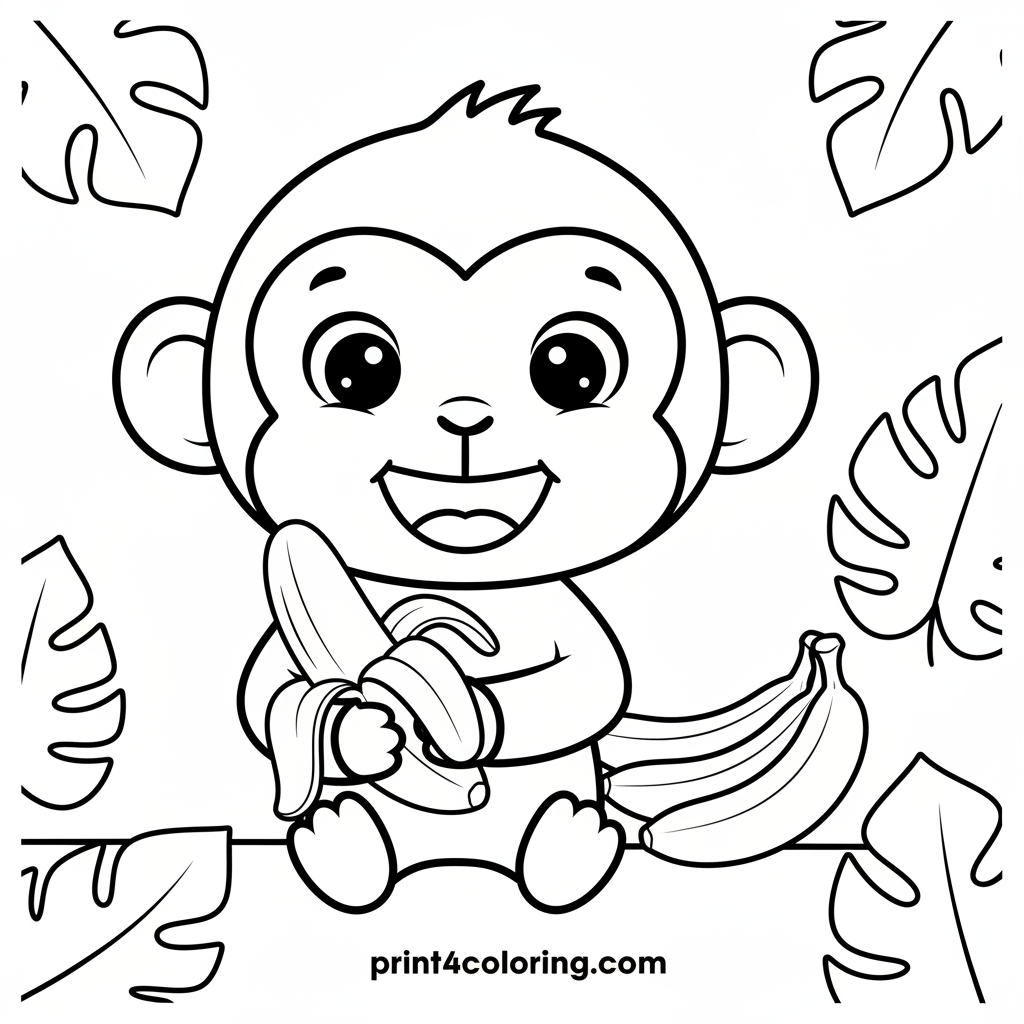 Meet our super cute, big-eyed monkey, happily peeling a delicious banana with a wide smile! A pile of other yummy bananas sits nearby, surrounded by simple jungle leaves. This delightful scene captures a joyful snack time. Grab your crayons and bring this happy jungle friend to life!