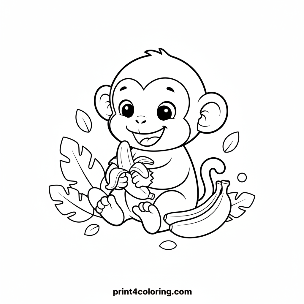Get ready for a super cute coloring adventure! This adorable monkey with big, happy eyes and a wide smile is enjoying the best banana snack ever. Surrounded by simple jungle leaves and more bananas, this cozy scene is perfect for little artists. Bring this cheerful jungle moment to life with your favorite colors!