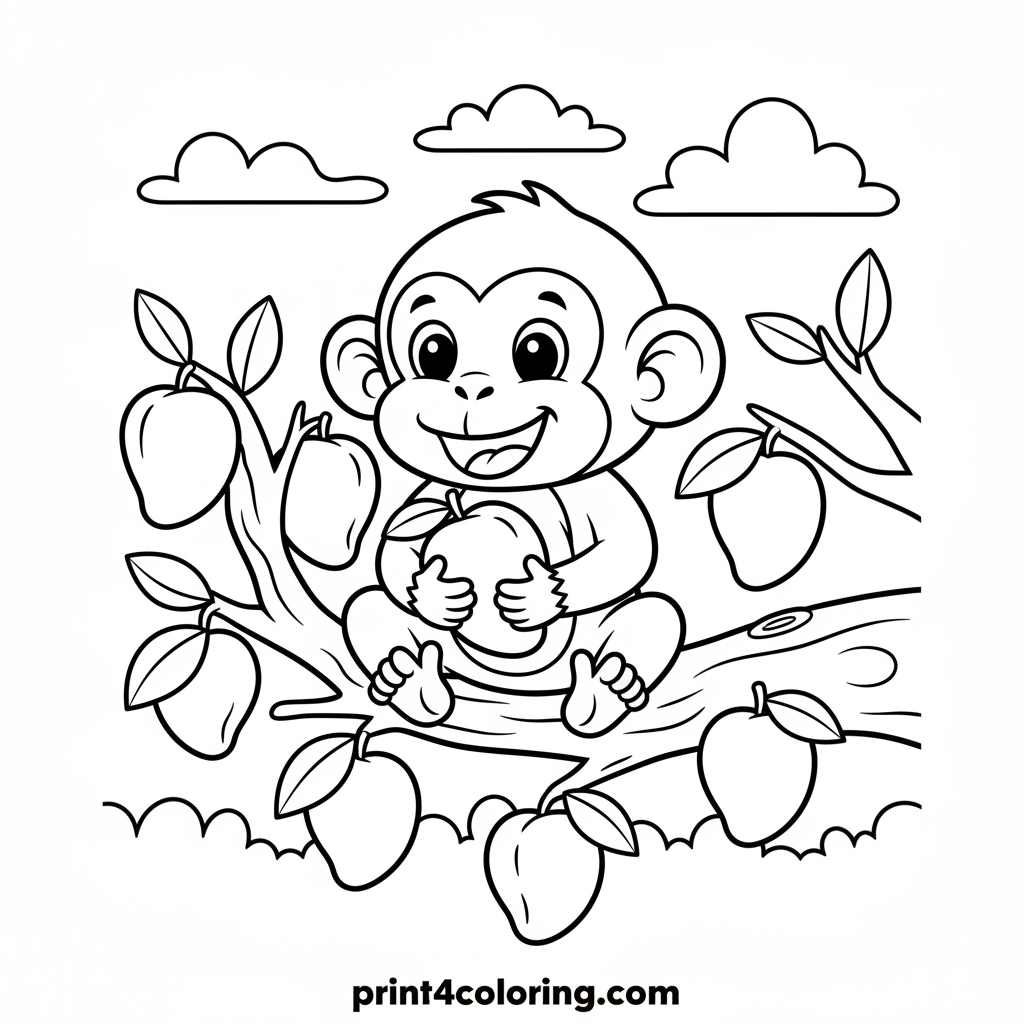 Join a cheerful, smiling monkey as it enjoys a delicious mango feast high up in a lush mango tree! This adorable monkey has big, round eyes and a ripe mango in its paws. Plenty of other juicy mangoes hang nearby, ready to be picked. A delightful scene for little artists to bring to life with vibrant colors.