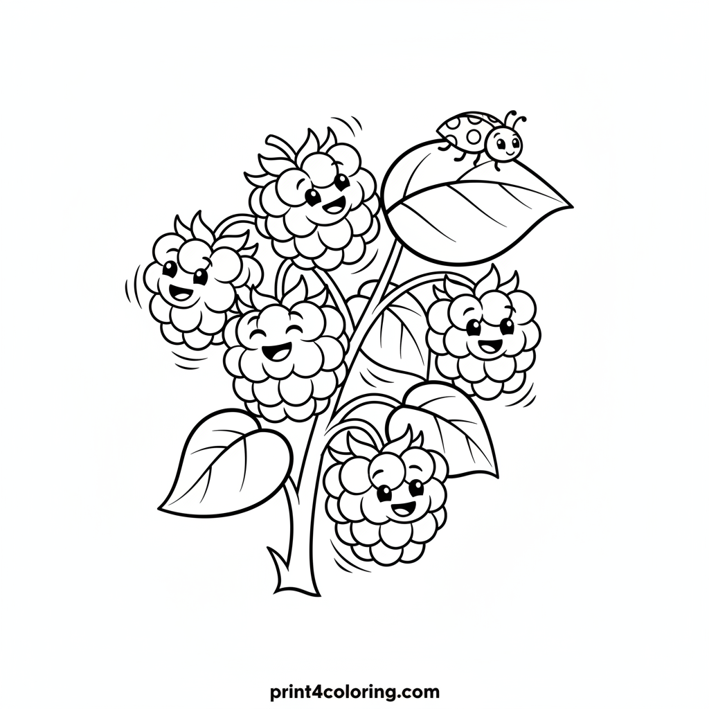 Discover a delightful patch of plump, smiling raspberries, ready for you to add a splash of color! A tiny, friendly ladybug is carefully exploring a green leaf nearby. Bring this sweet nature scene to life with your favorite hues, creating a vibrant and joyful berry adventure.