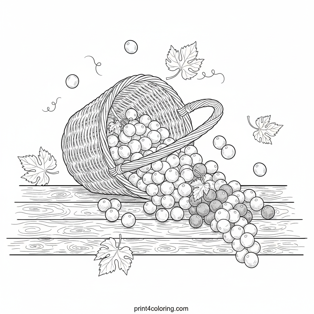 Dive into a delightful scene featuring a beautiful woven basket overflowing with juicy green, red, and purple grapes! Discover the intricate details of each grape, the delicate vine leaves, and the rustic wooden table. This expert-level page invites you to bring this abundant harvest to life with your favorite colors.