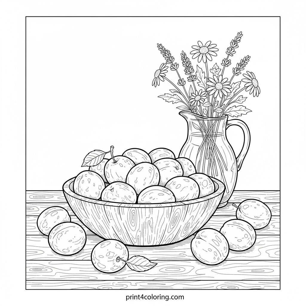 Step into a beautiful scene of nature's abundance! This detailed coloring page features a rustic wooden bowl overflowing with ripe plums, scattered across a textured table. A charming vintage pitcher holds a small bouquet of wildflowers, inviting you to add vibrant colors to this peaceful, classic still life.