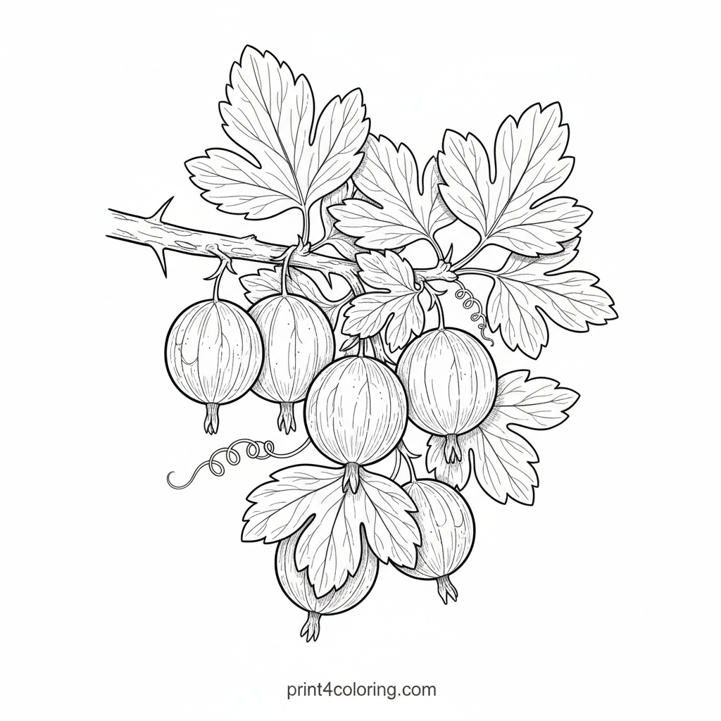 Explore the detailed beauty of a gooseberry branch, brimming with ripe, textured fruit and leafy greens. This close-up view invites you to color the delicate veins of the leaves, the tiny hairs on the thorns, and the unique patterns on each juicy gooseberry. A perfect challenge for expert colorists!