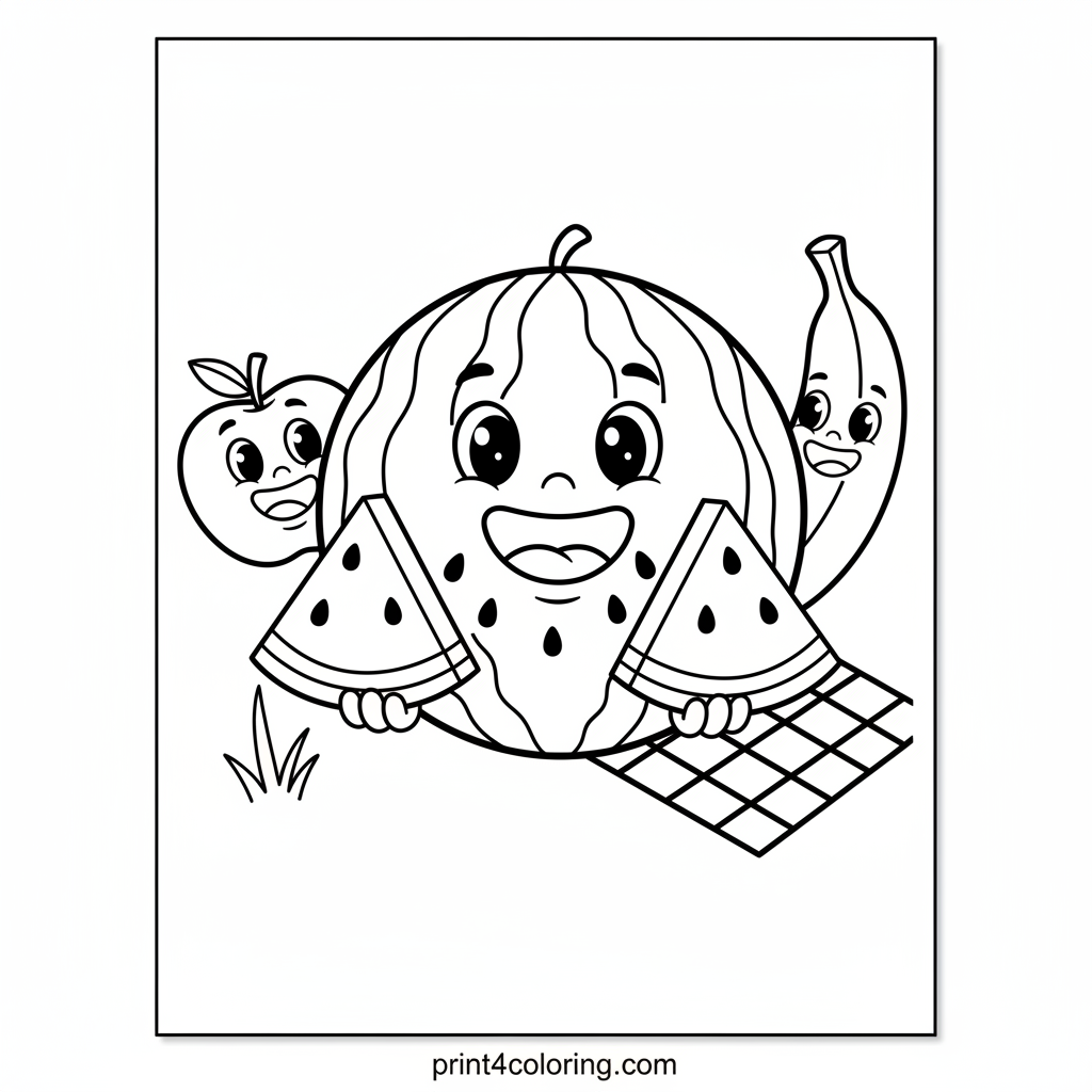 Join a cheerful watermelon character as it hosts a delightful picnic! See the big, friendly watermelon sharing juicy slices with its adorable fruit friends, including a giggling apple and a happy banana. This sunny park scene is bursting with fruity fun, perfect for little artists to bring to life with bright, happy colors.