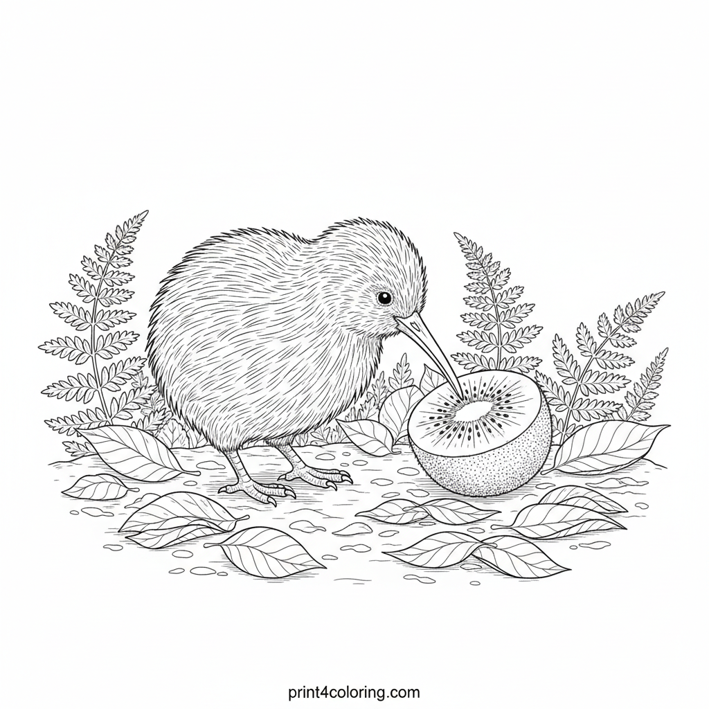 Explore the enchanting world of the friendly kiwi bird! This intricate coloring page features a small, fluffy kiwi bird gently nudging its namesake fruit on a lush forest floor. Delicate feathers and textured fruit await your artistic touch amidst fallen leaves and ferns, offering a delightful challenge for expert colorists.