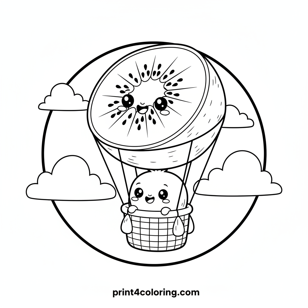 Join our cheerful kiwi fruit friend on an amazing journey high above the clouds! This adorable page features a happy kiwi character peeking from a basket, beneath a whimsical hot air balloon shaped like a giant kiwi slice. Float along with soft, puffy clouds and bring this cozy sky scene to life!