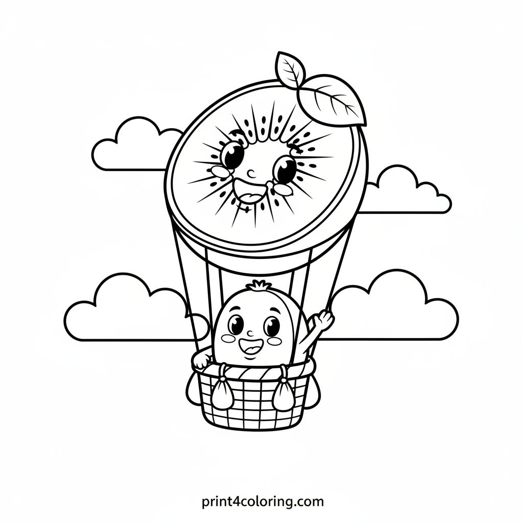 Join our cheerful kiwi fruit friend on an exciting journey high above the clouds! This adorable coloring page features a happy kiwi character peeking from the basket of a giant hot air balloon, shaped just like a yummy kiwi slice. Imagine gentle breezes as you bring this whimsical scene to life with your favorite colors.